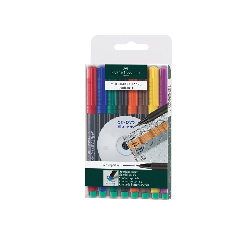 Busta 8 colori. Marcatore adatto alla maggior parte delle superfici, ideale per lucidi, CD e tutte le superfici lisce. Speciale gomma sul retro che lo rende cancellabile. Astuccio da 8 colori: nero, marrone, verde, blu, viola, rosso, arancio e giallo. Punta 0,4mm.