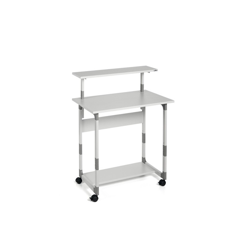 Struttura in acciaio verniciato con polveri e possipoliestere antigraffio e raccordi angolari in plastica resistente. Regolabile in altezza aggiungendo le apposite prolunghe in plastica da 20cm. Dotata di 3 ripiani fissi in melaminico e 4 ruote pivottanti di cui 2 bloccabili. Dimensioni: l 800 x p 564mm - h 925/1225mm.