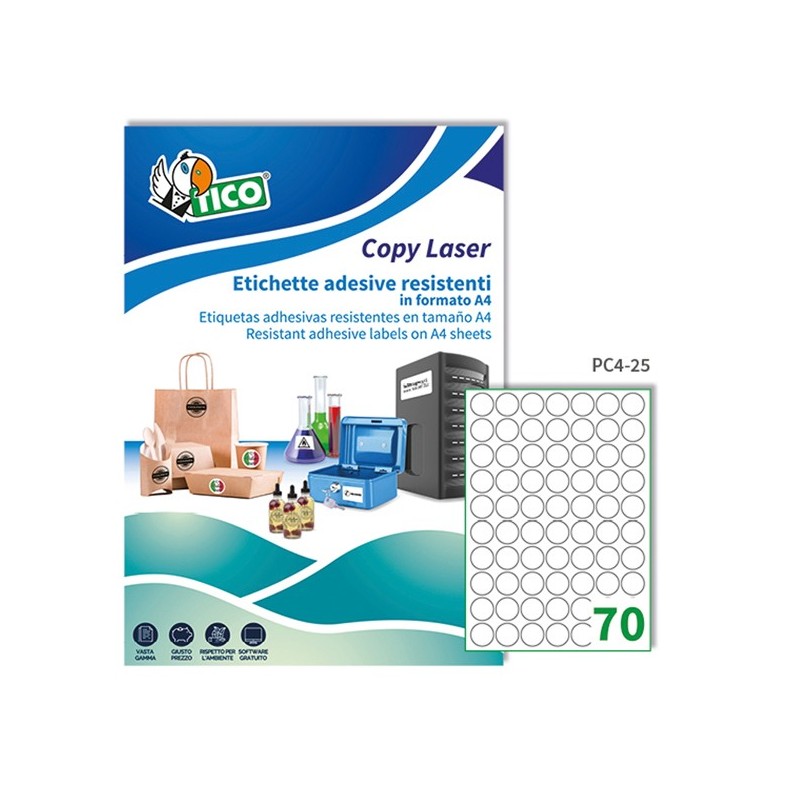 Le etichette Tico Press Clear sono etichette autoadesive in formato A4, realizzate in poliestere trasparente lucido, 73 gr./mq.Disponibili in diverse forme, in confezioni da 100 fogli. Stampabili con macchine offset, tipografiche, serigrafiche e laser a colori.