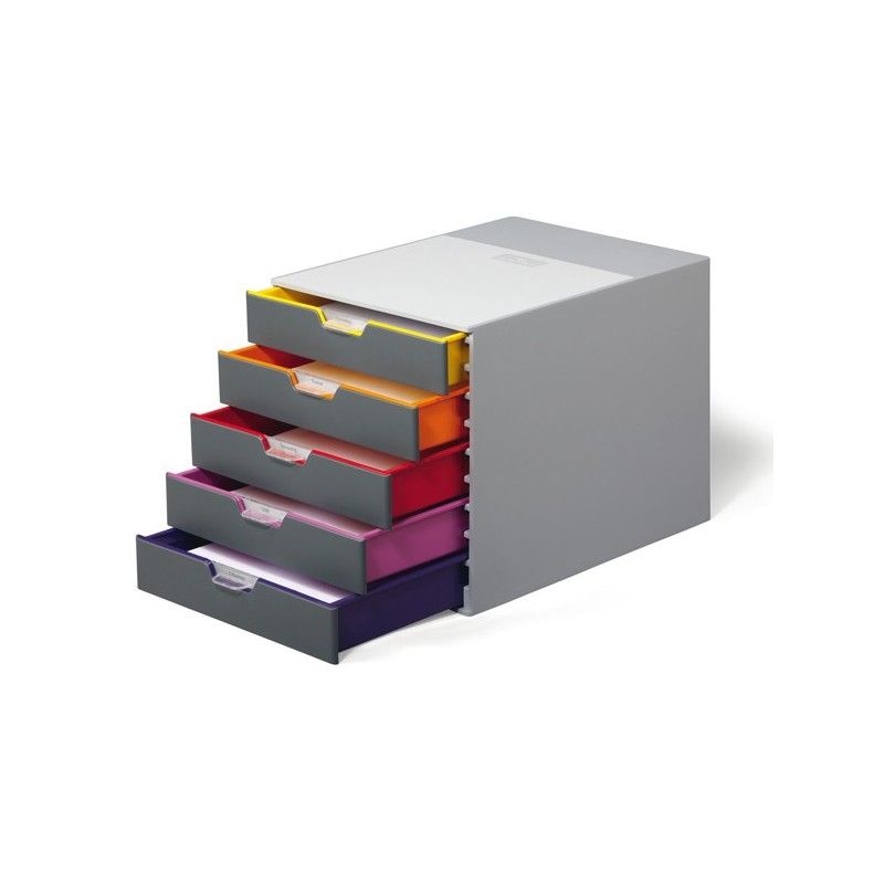 Cassettiere Varicolor a 5 cassetti solida e durevole, realizzata in materiali di alta qualit'. Design moderno e ricercato caratterizzato da cassetti con interno e profilo in 5 differenti colori, visibili anche a cassetto chiuso, che facilitano la classifi cazione del contenuto. Ogni cassetto, alto 5cm, dotato di fermo fine corsa e portaetichette personalizzabile e removibile. Impilabili e affiancabili. Dimensioni 28x35,6cm - H29,2cm.