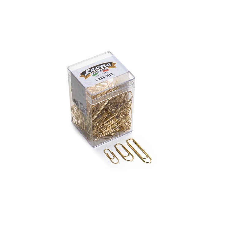 Scatola in plastica trasparente con assortimento di fermagli ottonati (circa 175 pezzi) in tre diverse misure (n.2-n.4-n.5)
