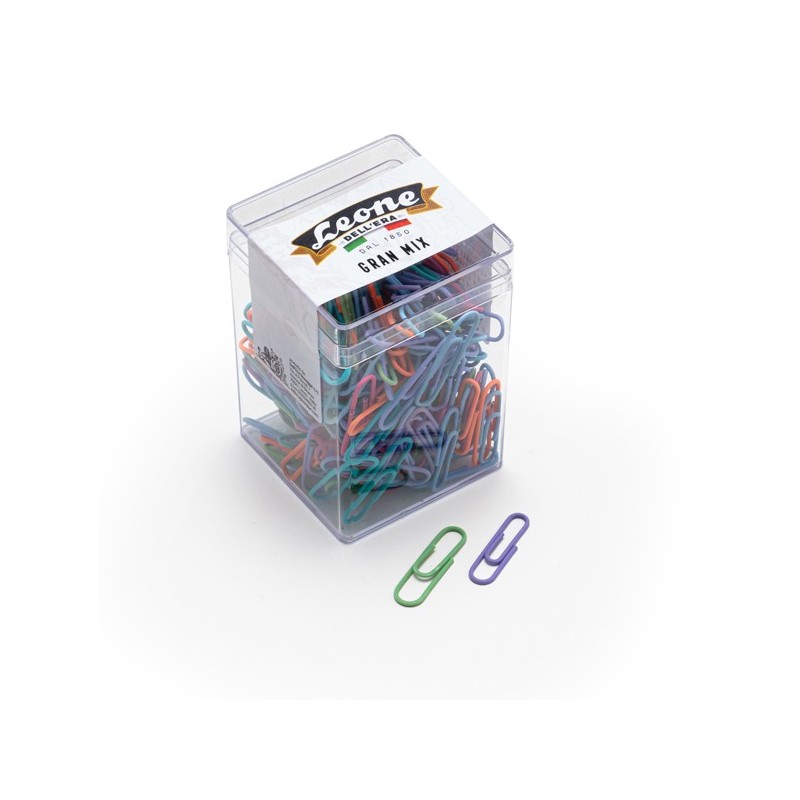 Scatola in plastica trasparente con assortimento di fermagli colorati rivestiti in pvc (circa 275 pezzi) in 2 diverse misure (n.3-n.4)