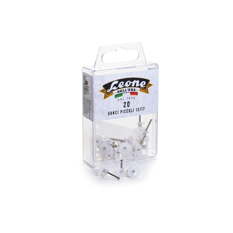 Scatola blister appendibile contenente 20 ganci trasparenti portaquadri con spilli Leone assortiti da 17mm di lunghezza