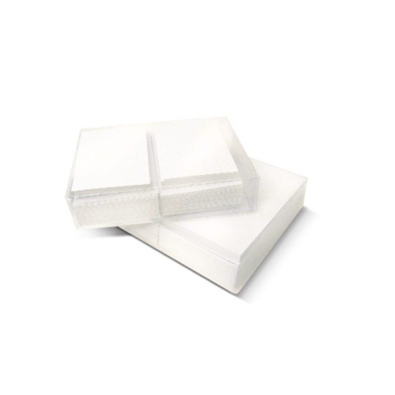 Scatola in acetato trasparente con 100 cartoncini bianco da 200gr liscio con 100 buste coordinate con patella e taglio a punta.
