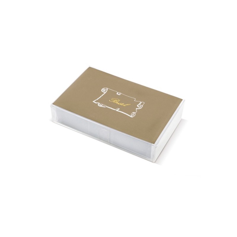 Scatola in cartone con 100 cartoncino bianco da 240gr liscio con 100 buste coordinate con patella e taglio a punta. Formato 4-75x112mm.