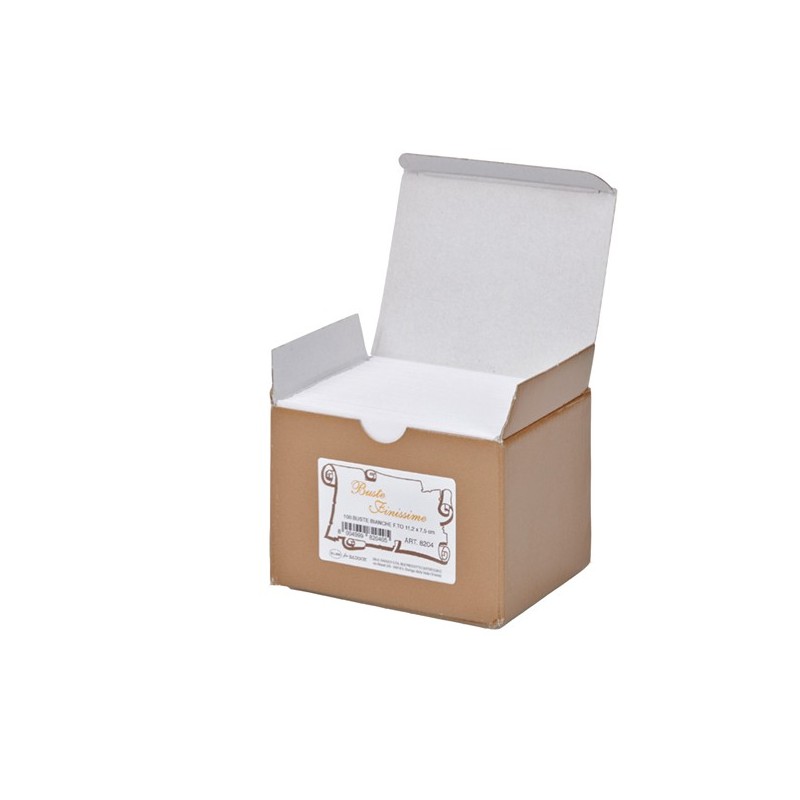 Scatola in cartone con 100 buste con patella e taglio a punta. Formato 4-75x112mm.