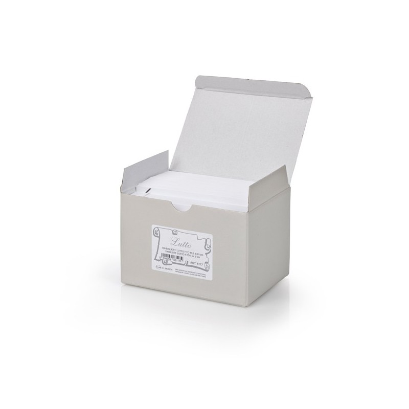 Busta e biglietto bianco con stampa a lutto in angolo. Biglietti da 200gr coordinati a buste con patella e taglio a punta da 85gr. Confezionate in scatole da 100 biglietti + 100 buste.