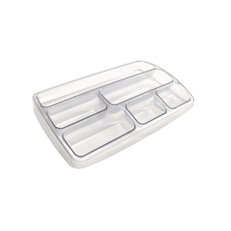 Bacinella portaoggetti dal formato compatto e di poco ingombro. Può essere usata all'interno di un cassetto o sulla scrivania. In plastica antiurto trasparente. Formato 25,3x3,4x15,7cm.