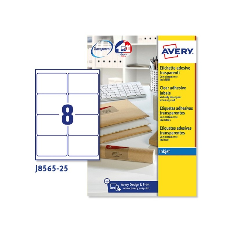Etichette trasparenti per indirizzi per buste e pacchi. Ottime per etichettare pacchi e buste colorate. Una volta applicata l'etichetta risulta completamente invisibile. Confezione da 25 fogli nel formato A4. Ogni foglio contiene 14 etichette. Per stampanti inkjet.