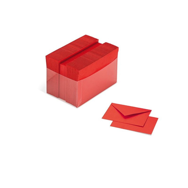 Buste e cartoncini in carta Burano Favini in scatole di acetato trasparente. Cartoncino da 200gr e Busta coordinata da 90gr. Formato 90x140mm. Colore: rosso.