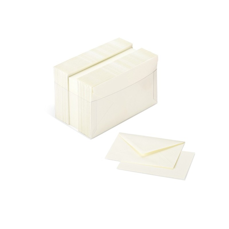 Buste e cartoncini in carta Burano Favini in scatole di acetato trasparente. Cartoncino da 200gr e Busta coordinata da 90gr. Formato 90x140mm. Colore: avorio.