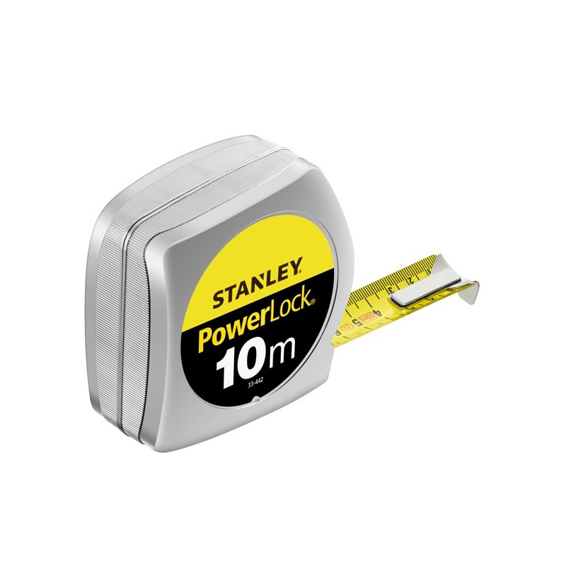 Flessometro con nastro in metallo. Sistema di blocco del nastro e rientro automatico.