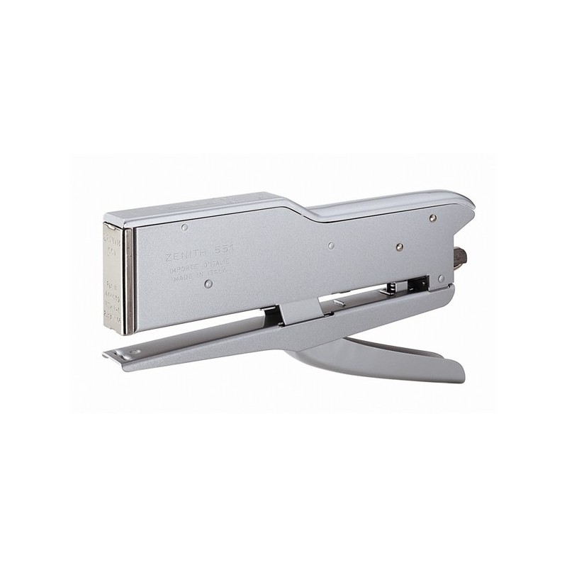 Cucitrice a pinza 551realizzata in metallo verniciato grigio e alluminio. Caricamento punti con spingipunti estraibile. Dotata di un dispositivo brevettato anti inceppamento. Capacità carica: 150 punti. Cucitura: punto chiuso. Capacità di cucitura 35fogli. Profondità di cucitura 70mm. Utilizza punti 24/6-8. Garanzia a vita per difetti di fabbricazione. Peso 435gr.