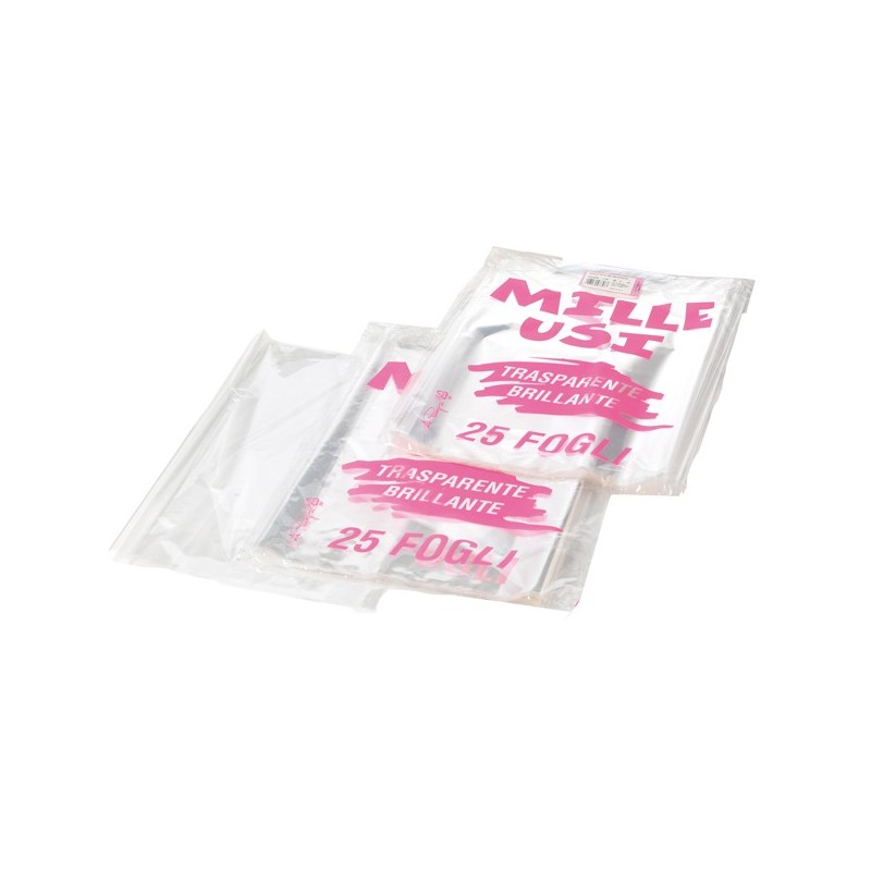 Cellophan trasparente. Dimensioni del singolo foglio: 100x130cm. Confezione da 25 fogli.