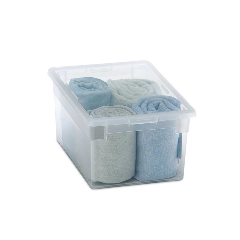 Contenitori multiuso in plastica trasparente ideali per riordinare e archiviare in modo intelligente e pratico. Dotati di maniglie a clip e di coperchio pieghevole per permettere l'accesso al contenuto anche quando fissato sul contenitore. Molto robusti e dal design moderno sono impilabili in modo stabile e forniscono una protezione perfetta contro umidità e polvere. Disponibili in 6 capacità.