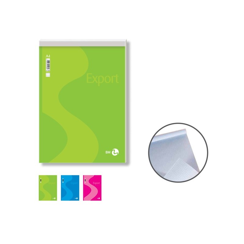 Blocco note Export con rilegatura punto metallico. Copertina da 130gr assortita in 3 colori. Formato A5- 15x21cm. Rigatura 5mm. 50 fg. 50gr.