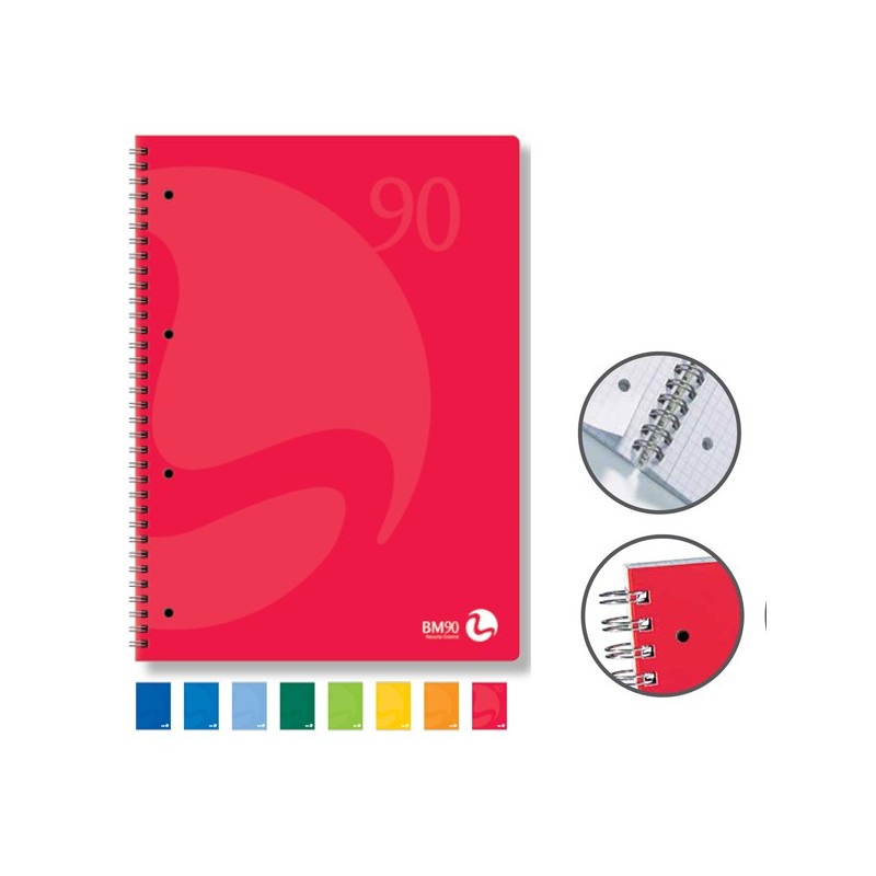 Quaderno spiratalo sul lato lungo. 2 copertine da 300gr stampata fronte-retro assortite in 8 colori. Copertina con plastificazione opaca e verniciatura serigrafica lucida. 4 fori e microperforatura. Carta bianca in pura cellulosa da 90gr.