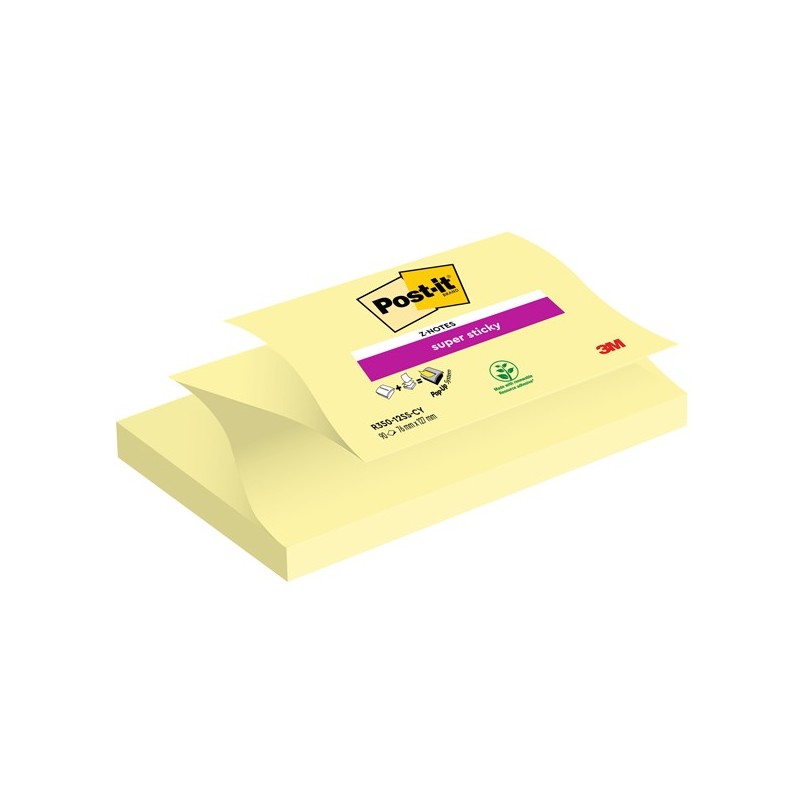 Blocchetti da 90 foglietti riposizionabili Giallo Canary. Grazie all'adesivo rinforzato si attaccano praticamente su tutte le superfici e non lasciano traccia. Ideali per superfici difficili o verticali. Incollatura a fisarmonica, un foglietto tira l'altro, utilizzabili con uno dei tanti dispenser per foglietti Post-it Z-Notes. Formato 76x127mm. Nuove confezioni in cartoncino riciclato.