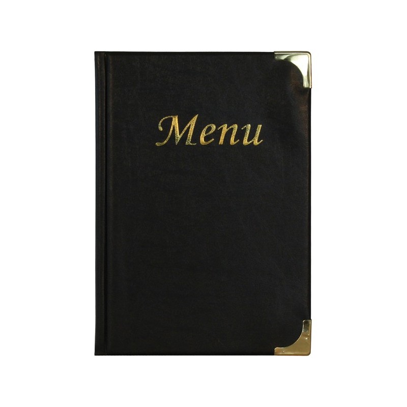 Porta menu' in pvc semplice e classico con angoli in metallo dorato. Formato da 4 buste trasparenti saldate sul dorso e 2 buste saldate sulle facce interne della copertina (per contenere in totale di 10 fogli formato a5
