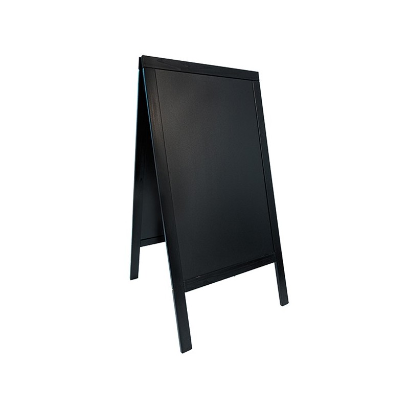 LAVAGNA NERA DA TERRA A CAVALLETTO CON DOPPIA FACCIA. CORNICE IN LEGNO DURO CON TRIPLA LACCATURA CHE LA RENDE IDONEA ALL'UTILIZZO ANCHE IN ESTERNO. SUPERFICIE SCRIVIBILE CON PENNARELLI A GESSO LIQUIDO, ANTIGRAFFIO, RESISTENTE AI RAGGI UV E ALLE DEFORMAZIONI DOVUTE AL CALORE.