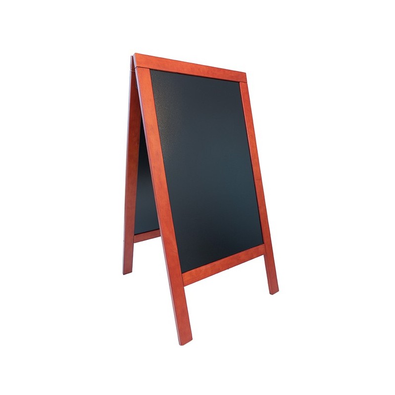 Lavagna nera da terra a cavalletto con doppia faccia. Cornice in legno duro con tripla laccatura che la rende idonea all'utilizzo anche in esterno. Superficie scrivibile con pennarelli a gesso liquido, antigraffio, resistente ai raggi uv e alle deformazioni dovute al calore.