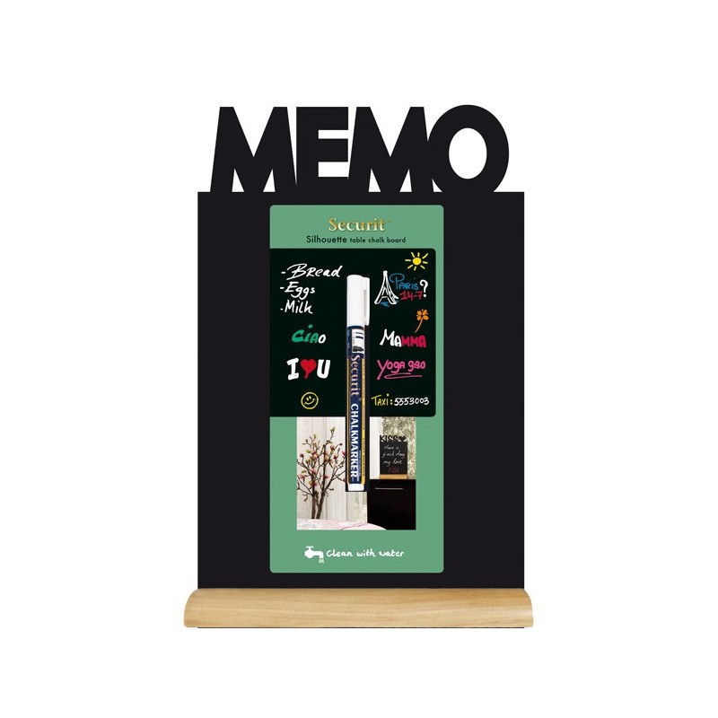 Formate da una base in legno duro laccato che sorregge una lastra removibile e scrivibile da entrambi i lati. fornire con un marcatore a gesso liquido bianco.