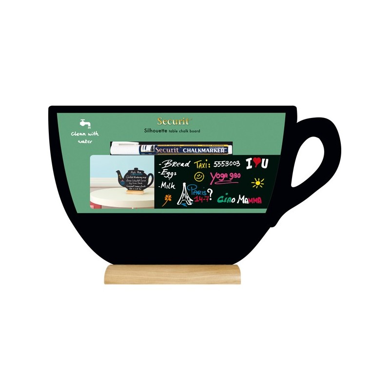 Formate da una base in legno duro laccato che sorregge una lastra removibile e scrivibile da entrambi i lati. Fornite con un marcatore a gesso liquido bianco.