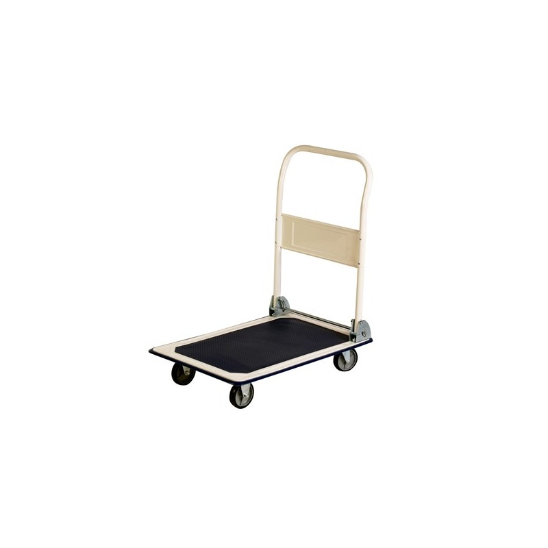 Carrello in lamiera rinforzata e maniglia tubolare ripiegabile tramite comando a piede. Piattaforma bordata in gomma e piano di carico rivestito con antiscivolo. Dotato di ruote in gomma piena, ruote anteriori fisse e ruote posteriori girevoli. Dimensioni: L74 x P48 x H83cm. Portata massima 150kg.