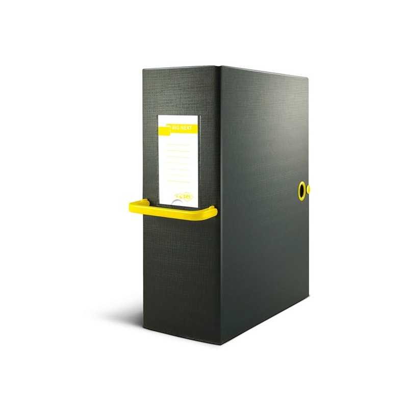 Cartelle in Colpan® nero (cartone rivestito in PVC) con chiusura a tre lembi. Maniglia in plastica gialla. Occhiello e bottoni automatici in metallo nel colore della maniglia. Etichetta intercambiabile colorata. Adatte per l'archiviazione e il trasporto di progetti, disegni, documenti e cartelline. Formato esterno: 260x360mm. Formato contenuto:250x350mm. Dorso 12cm.
