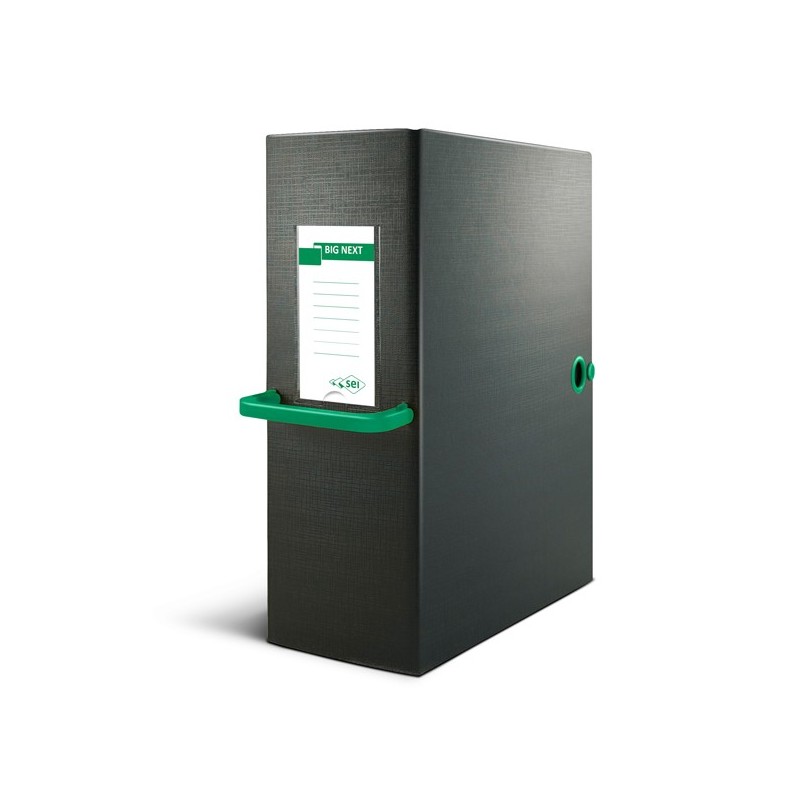 Cartelle in Colpan® nero (cartone rivestito in PVC) con chiusura a tre lembi. Maniglia in plastica verde. Occhiello e bottoni automatici in metallo nel colore della maniglia. Etichetta intercambiabile colorata. Adatte per l'archiviazione e il trasporto di progetti, disegni, documenti e cartelline. Formato esterno: 260x360mm. Formato contenuto:250x350mm. Dorso 16cm.