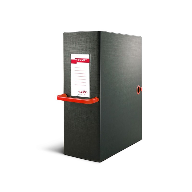 Cartelle in Colpan® nero (cartone rivestito in PVC) con chiusura a tre lembi. Maniglia in plastica rossa. Occhiello e bottoni automatici in metallo nel colore della maniglia. Etichetta intercambiabile colorata. Adatte per l'archiviazione e il trasporto di progetti, disegni, documenti e cartelline. Formato esterno: 260x360mm. Formato contenuto:250x350mm. Dorso 20cm.