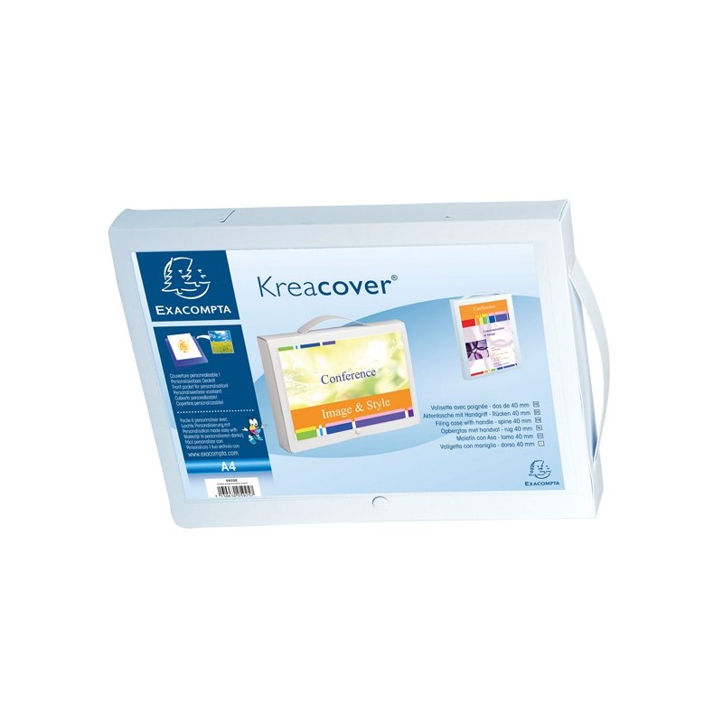 Cartella bianca in polipropilene con tasca per la personalizzazione sul davanti. Maniglia retraibile sin in orizzontale che in verticale. Formato 24x32cm Dorso 4cm.