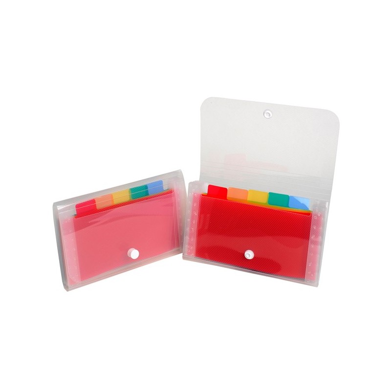 Cartellla a soffietto in PPL cristallo con interno in PPLcolorato. Dorso estensibile e chiusura con bottone. Formato utile: 11x18cm - 6 tasche.