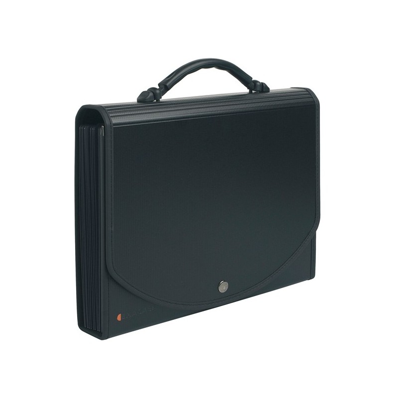 Cartella a valigetta in PPL riciclato con interno in PPL. Trasparente grigio. Tasti personalizzabili con etichette bianche. Maniglia ergonomica e pieghevole. Colore nero. Formato esterno: 33x26cm. 13 tasche.