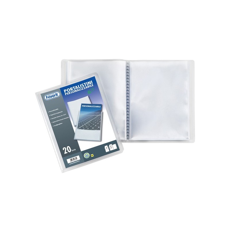 Portalistino in Naturene (polipropilene) con copertina trasparente personalizzabile e flessibile. Le buste sono fisse e aperte sul lato superiore. Finitura liscia ultra cristallina. Formato contenuto 15x21cm(A5). Made in Italy