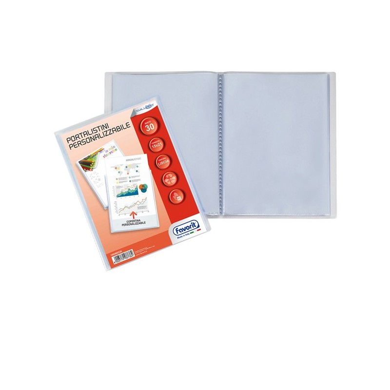 Portalistino in Naturene (polipropilene) con copertina trasparente personalizzabile e flessibile. Le 30 buste sono fisse e aperte sul lato superiore. Finitura liscia ultra cristallina. Formato contenuto 15x21cm(A5). Made in Italy