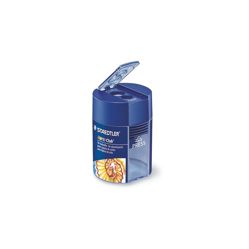 Temperamatite NORIS a 2 fori ideale per matite colorate fino a 10,2mm di diametro. Meccanismo interno in metallo con lama in acciaio. Contenitore con chiusura trasparente anticaduta trucioli.
