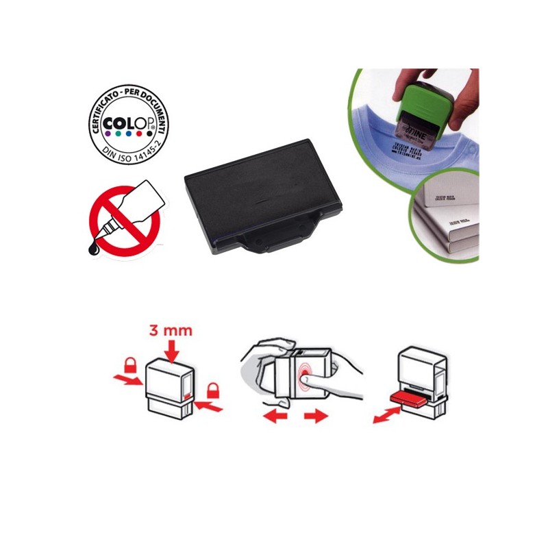 Tampone per timbri autoinchiostranti. Inchiostro speciale per timbri come cotone e poliester. Resistente a numerosi lavaggi anche a 90gradi. Può effettuare circa 1000 timbrature. Montabile sul timbro Mine Colop cod. 72045.