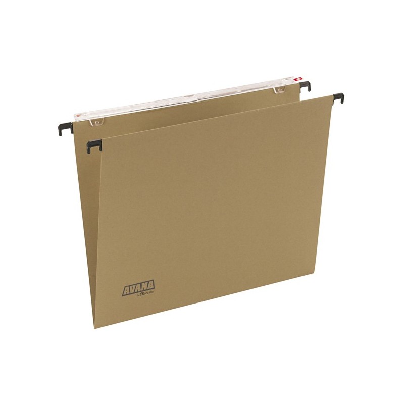 Cartelle sospese economiche e rispettose della natura. Realizzate in cartoncino Manilla, 100% riciclato post-consumo, dal peso di 220 gr/mq. Aste di sospensione in filo d'acciaio armonico (80% riciclato) con ganci di scorrimento in polistirene nero. Sistema di assemblaggio tramite colla a caldo. Portaetichette già montato in plastica trasparente ad effetto lenticolare lungo 29 cm. Sistema di collegamento in continuo delle cartelle ad incastro. Etichette con bordo colorato per l’immediata individuazione dei fascicoli. Interasse 33 cm. fondo a V. Conf. 50 pezzi Colore Avana Garanzia Prodotto: 3 anni Formato esterno 31,3x24,5cm. MADE IN ITALY
