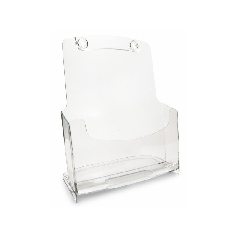 Portadepliant da parete e da banco a tasca singola f.to a4. design pulito ed essenziale, possono entrare uno nell'altro così da guadagnare spazio sul banco. in materiale plastico perfettamente trasparente con dorso leggermente inclinato per garantire la massima stabilitÓ del materiale esposto. Accoppiabili ad incastro e appendibili a parete. Dimensione 23,7x28,3x12cm.