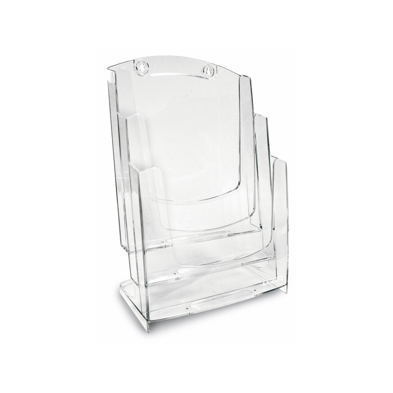 Portadepliant da parete e da banco a tasca multipla (3 tasche f.to a4). Design pulito ed essenziale, in materiale plastico perfettamente trasparente con dorso leggermente inclinato per garantire la massima stabilitàdel materiale esposto. Dimensione 23,7x35,7x18,2cm.