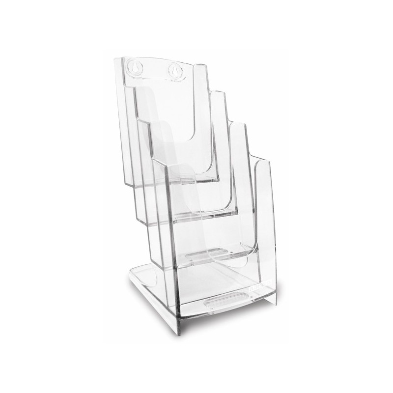 Portadepliant da parete e da banco a tasca multipla (4 tasche f.to 1/3 a4). Design pulito ed essenziale, in materiale plastico perfettamente trasparente con dorso leggermente inclinato per garantire la massima stabilitÓ del materiale esposto. Dimensione 11,5x26,5x18,4cm.