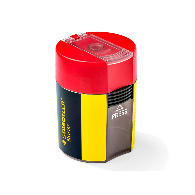 Temperamatite NORIS a 1 foro per tutti i tipi di matite fino a 8,2mm. Meccanismo interno in metallo con lama in acciaio. Portatrucioli rotondo in plastica, trasparente, con chiusura foro.