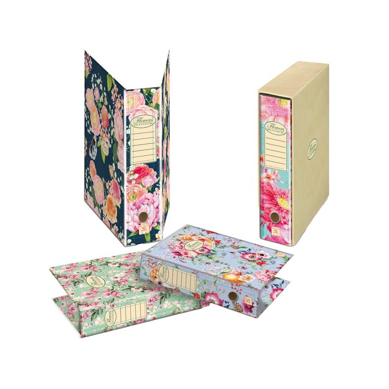 Registratore protocollo dorso 8cm con custodia linea Pigna Nature Flowers . Formato esterno cm 28,5x35. In cartone rivestito con carta uso mano stampata a motivi floreali.