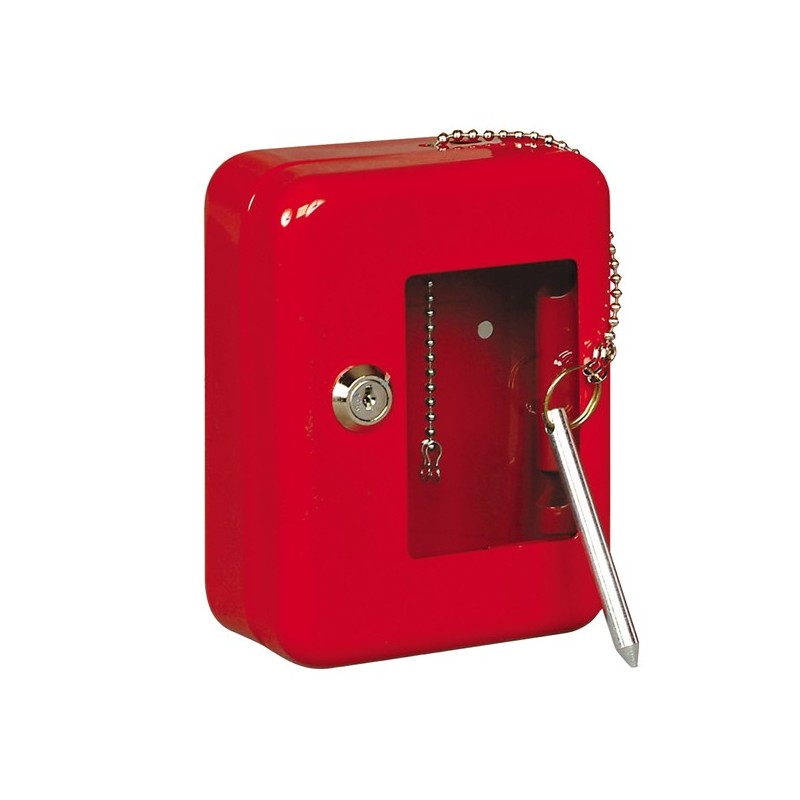 Cassetta per chiavi di emergenza con corpo e coperchio in lamiera di acciaio verniciata, spessore 8/10. Vetro trasparente spessore 2mm. Dotata di martelletto in tondino tornito zincato. Predisposta per fissaggio a parete.