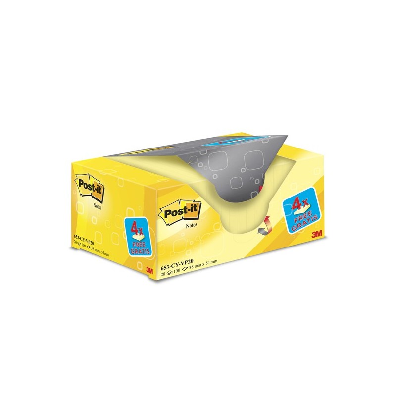Foglietti Post-it Giallo Canary in confezione promozionale. Ideali per chi ricerca un prodotto di qualità ad un prezzo conveniente. Formato 38 x 51mm. VALUE PACK 16+4 blocchetti omaggio.