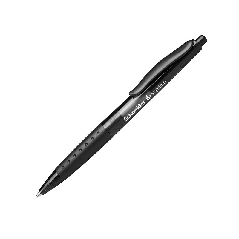 Penna a sfera con meccanismo a scatto con impugnatura gommata antiscivolo. Materiale traslucido dai colori vivaci. Inchiostro indelebile a norma ISO 12752-2 (tranne rosso). Refill sostituibile. Punta M. Colore: nero.