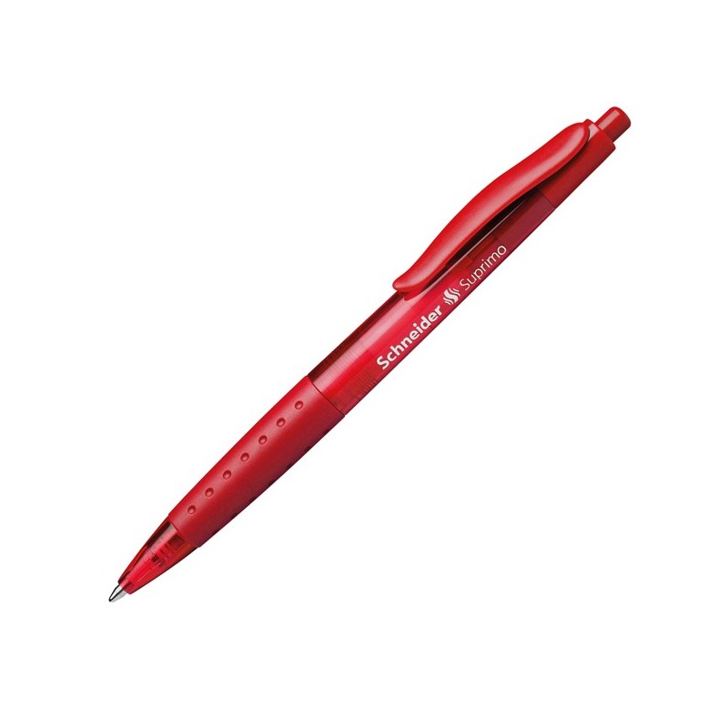 Penna a sfera con meccanismo a scatto con impugnatura gommata antiscivolo. Materiale traslucido dai colori vivaci. Inchiostro indelebile a norma ISO 12752-2 (tranne rosso). Refill sostituibile. Punta M. Colore: rosso.
