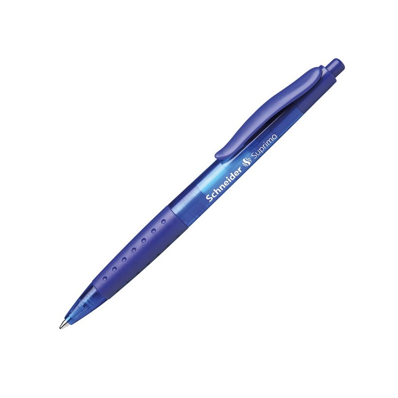 Penna a sfera con meccanismo a scatto con impugnatura gommata antiscivolo. Materiale traslucido dai colori vivaci. Inchiostro indelebile a norma ISO 12752-2 (tranne rosso). Refill sostituibile. Punta M. Colore: blu.