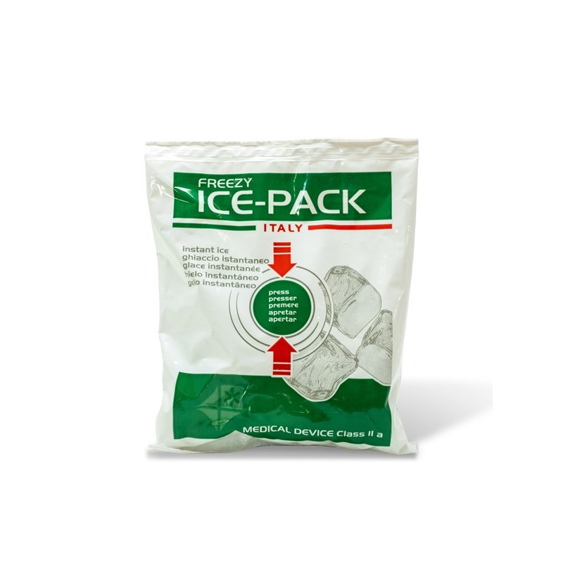 Ghiaccio istantaneo in sacchetto di plastica. Mantiene fredda la parte lesa per circa 25/30minuti, in funzione della temperatura esterna.